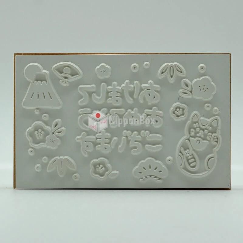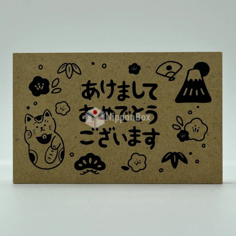 Stamp with Japanese New Year greeting with typical new year related Japanese symbols.